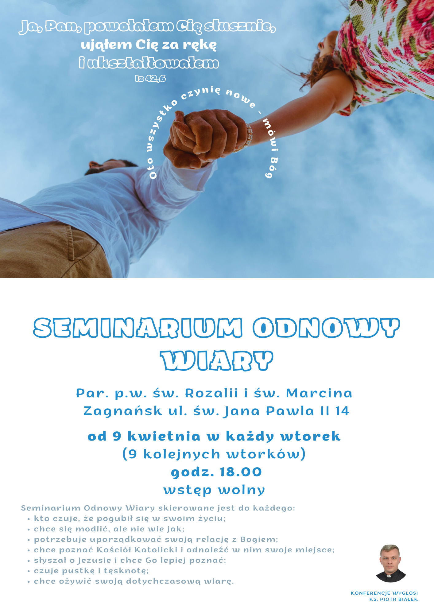 9.04 we wtorek rozpoczniemy Seminarium Odnowy Wiary które jest szansą postawienia sobie ważnych pytań, odkryć siłę wiary i doświadczyć osobistych relacji z Jezusem. Proszę zabierzcie ze sobą ulotki – zaproszenia ze stolików.